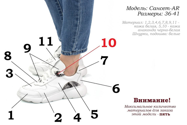 Для замовлення моделі у поєднанні різних матеріалів скористайтесь схемою замовлення, вказавши обрані артикули відповідно до нумерації на фото нижче. Це допоможе нам правильно виготовити Ваше замовлення.