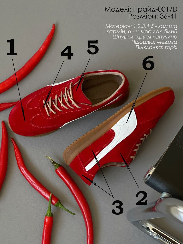 | Артикул матеріалу: | 1,2,3,4,5 — Замша "кармін", 6 — Шкіра "лак білий" |
